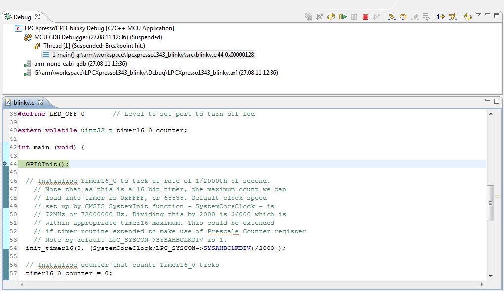 Собственно теперь можно нажать <F8> Resume и программа начнет выполняться, а светодиод на плате вместо тусклого свечения начнет мигать. При выборе <Ctrl>+<F2> Terminate программа в контроллере так же продолжит выполнение, только мы больше не сможем повлиять на ход её выполнения до запуска нового сеанса отладки.