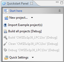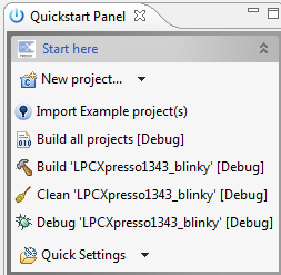 Что ж, нам осталось подключить нашу плату LPCXpresso к USB порту компьютера и выбрать в панели Quickstart panel появившийся пункт Debug ‘LPCXpresso1343_blinky’